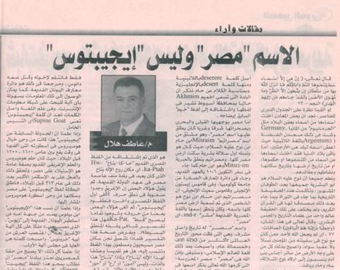 كتبت مقالة بعنوان " الإسم مصر وليس إيجبتوس " منذ أكثر من عامين ثم نشرتها على صفحات منتدانا الحبيب فى 11/5/ 2004 بعنوان " ياعشاق مصر" ، ومنذ ذلك الوقت وهى تنتقل من منتدى إلى منتدى آخر بعد استئذانى أشهرهم من حيث عدد المداخلات والتعليقات هو "ديوان العرب" ، ثم تم ترجمتها إلى اللغة الإنجليزية وتعليقها بلوحة الإعلانات بمدرسة " أركان " بسيدنى بأستراليا .. تحت عنوان : Say I'am Misrain Not Egyptian  ( ملاحظة : المدير الشرفى لتلك المدرسة هو شقيق لى ) .