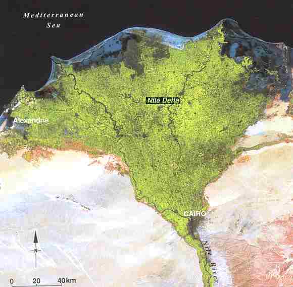 أما الصورة المرفقة الموضحة أسفل فهى صورة ملتقطة من الفضاء بالأقمار الصناعية لدلتا النيل مصدرها وزارة الرى :