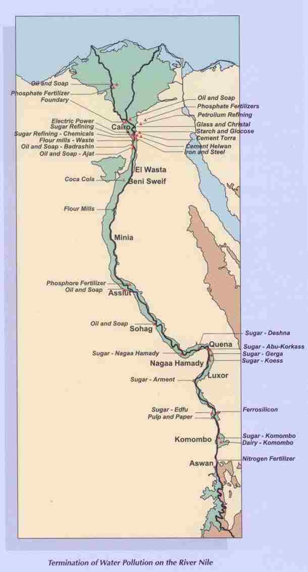 وخلال عام 2000/2001 أعلنت وزارة البيئة المصرية بوجوب خلو مجرى النهر من كافة المخلفات الصناعية الناتجة عن صرف عدد 34 شركة صناعية كبرى بما يقدر بحوالى 100 مليون متر مكعب من السموم فى مجرى النهر . وتشكلت لجان من وزارة البيئة ووزارة الرى وشرطة المسحات المائية لمراقبة التهر ورصد المخالفات وضبطها .. والخريطةالمرفقة تبين مواقع معظم تلك المصانع على ضفتى النهر .