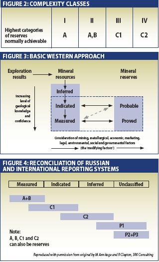 ثم تناول الكود كيفية عرض نتائج الأبحاث الجيولوجية وتقييم الراسب المعدنى فنيا واقتصاديا ، وكيفية تحديد فئات الموارد Resources وتصنيفها ، وكيفية تحديد فئات الإحتياطيات Reserves وتصنيفها ، والعلاقة التبادلية بين الموارد والإحتياطيات كما هى موضحة بالشكل التخطيطى رقم (2) . كما يعرض الكود تفصيلا كيف يصل محرر التقرير إلى هذا التحديد .. كما نص الكود  على الحد الأدنى من المعايير الواجبة التطبيق فى هذا الشأن ، وعرض لكل معيار على حدة وأوضح كيفية استخدامه وتطبيقه ، وعدد تلك المعايير المنصوص عليه بالكود أربعين معيارا .. ثم خصص بعد ذلك معاييرا تختص بالماس والأحجار الكريمة ، ثم ألحق بالكود كودا آخرا خاصا بموارد الفحم واحتياطياته (الشكل التخطيطى رقم 3) .